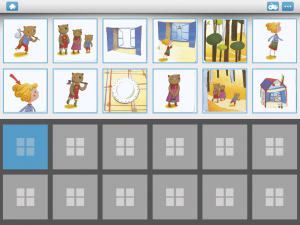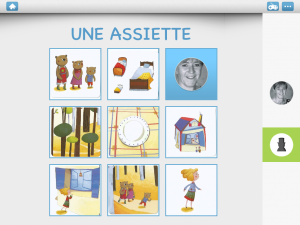 – Bingo : une « bataille » de reconnaissance de mots entendus (tapoter l’image qui correspond) à plusieurs joueurs (comme le mémory) ; j’entends, je tapote l’image.
